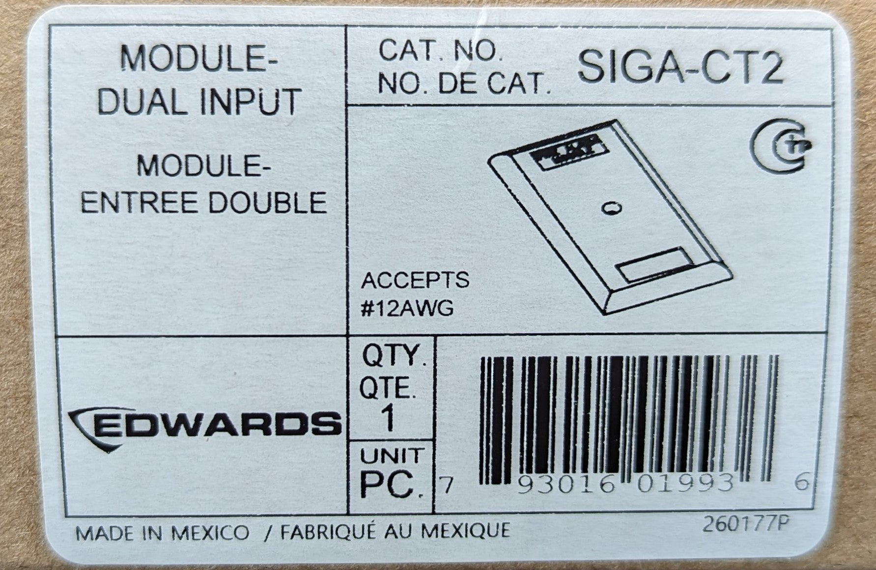 The SIGA-CT2 Dual Input Module is an addressable device that is used to connect one or two Class B, normally open, alarm, supervisory, or monitor type dry contact initiating device circuits (IDCs) to a Signature loop controller. The module can be used for alarm, supervisory, or monitor type applications depending on the personality code assigned to it. The personality code downloaded to the module by the loop controller during system configuration determines the module’s function.