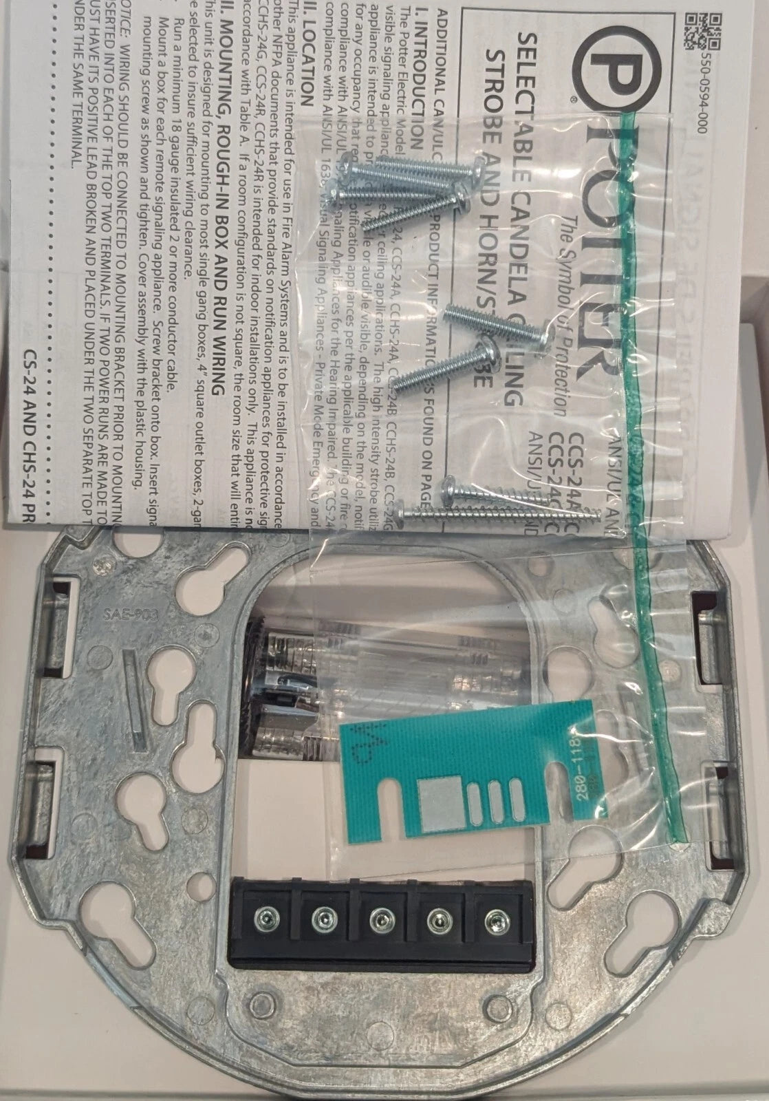 The Potter CS Series is a ceiling mount strobe or horn/strobe combination that offers dependable audible and visual alarms and the lowest current consumption. The CS offers tamperproof field selectable candela options of 15, 30, 75, 95, 115 and 150 candela. The CS Series has a very minimal operating current and has a minimum flash rate of 1Hz regardless of input voltage.